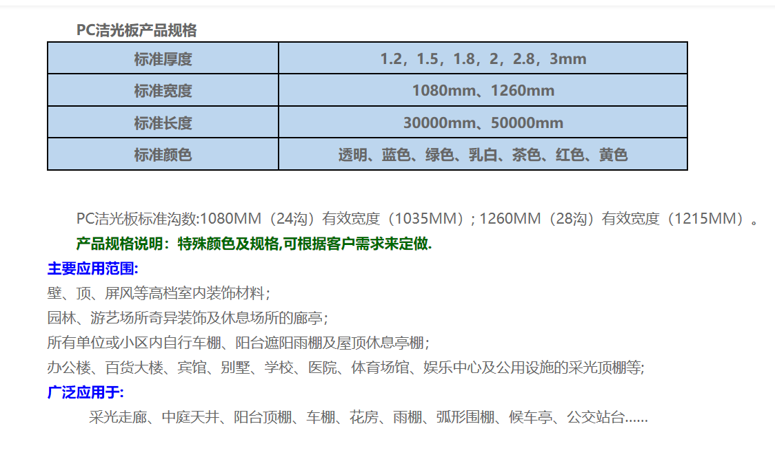 主營:PC耐力板、PC波浪瓦、PC陽光板、PC潔光板、PC雨陽蓬、PC壓條、PC配件,承接任何塑料工藝成型深加工,昊塑板材具有:抗紫外線、耐老化、抗沖擊、隔音、隔熱、難燃等優(yōu)異性能,成為樓頂采光、高速公路隔音、燈箱廣告、候車廳、家居陽臺(tái)等的不錯(cuò)之選。