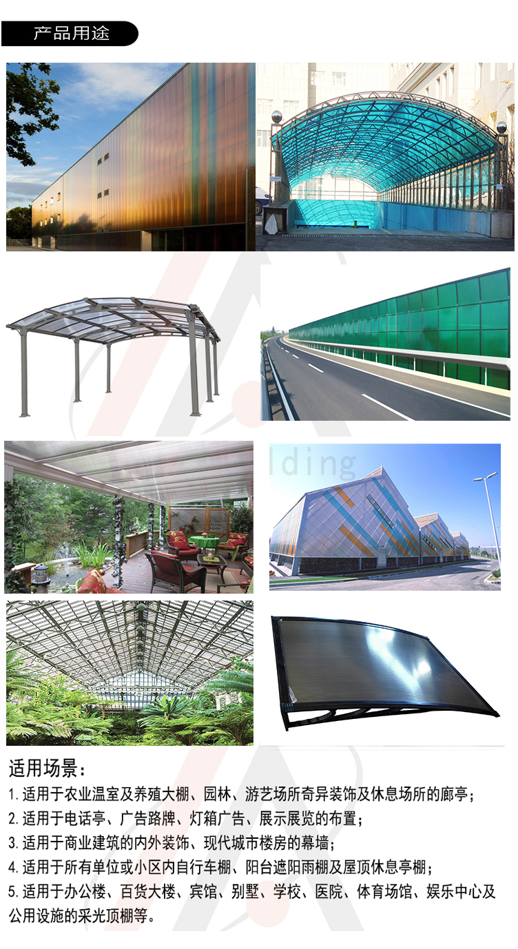 園林、游藝場所奇異裝飾及休息場所的廊亭; 商業(yè)建筑的內(nèi)外裝飾、現(xiàn)代城市樓房的幕墻; 壁、頂、屏風(fēng)等高檔室內(nèi)裝飾材料; 高速公路及城市高架路隔音屏障; 農(nóng)業(yè)溫室及養(yǎng)殖大棚; 現(xiàn)代生態(tài)餐廳頂棚; 所有單位或小區(qū)內(nèi)自行車棚、陽臺遮陽雨棚及屋頂休息亭棚; 辦公樓、百貨大樓、賓館、別墅、學(xué)校、醫(yī)院、體育場館、娛樂中心及公用設(shè)施的采光頂棚等 |